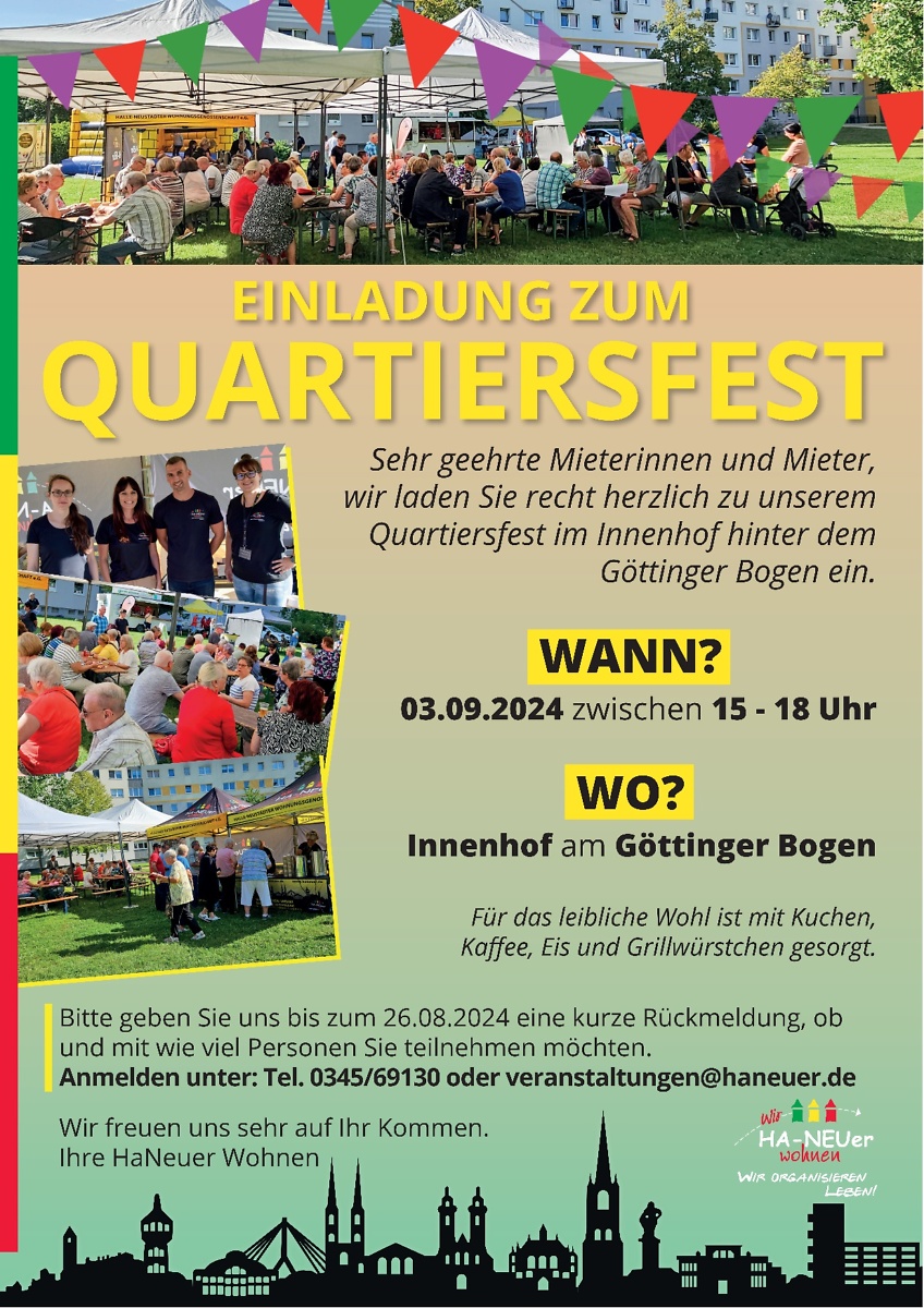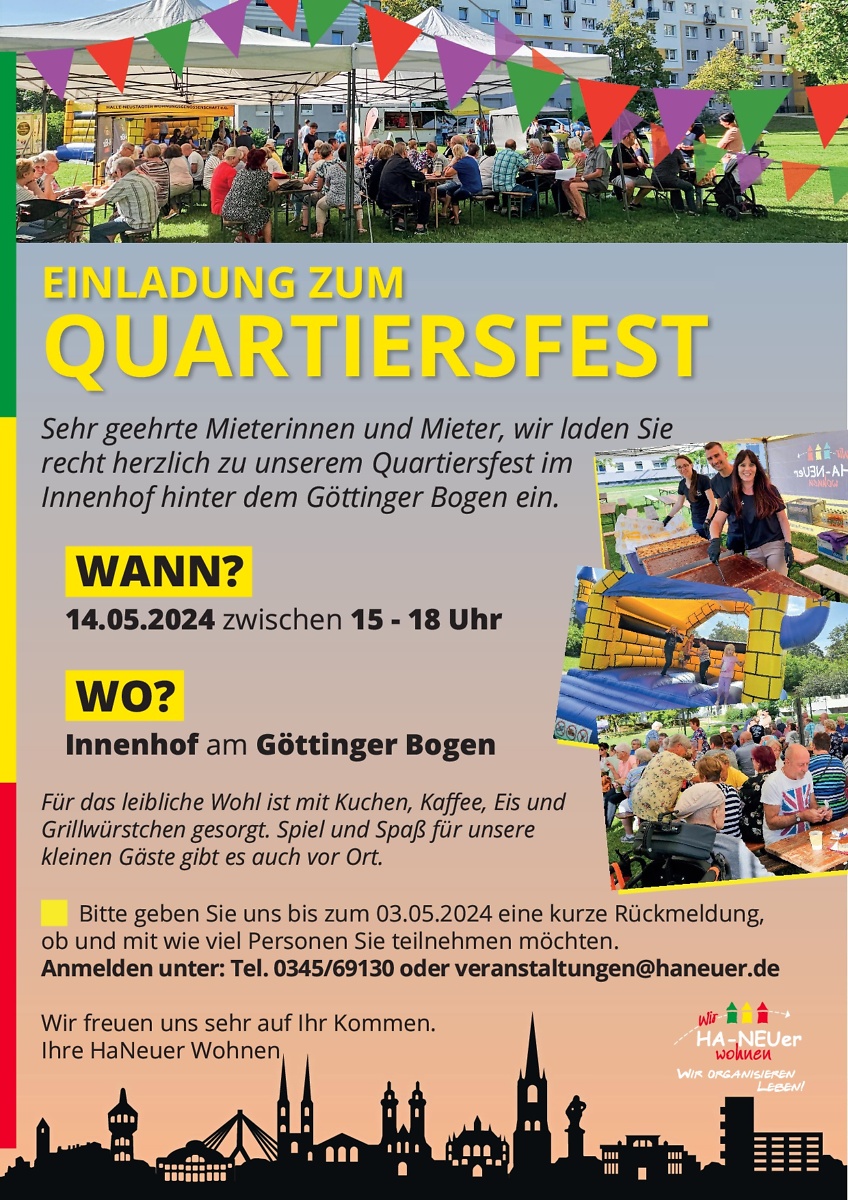 Hierfür laden wir Sie zu unserem Quartiersfest am 14.05.2024 von 15-18 Uhr (Innenhof Göttinger Bogen) ein.