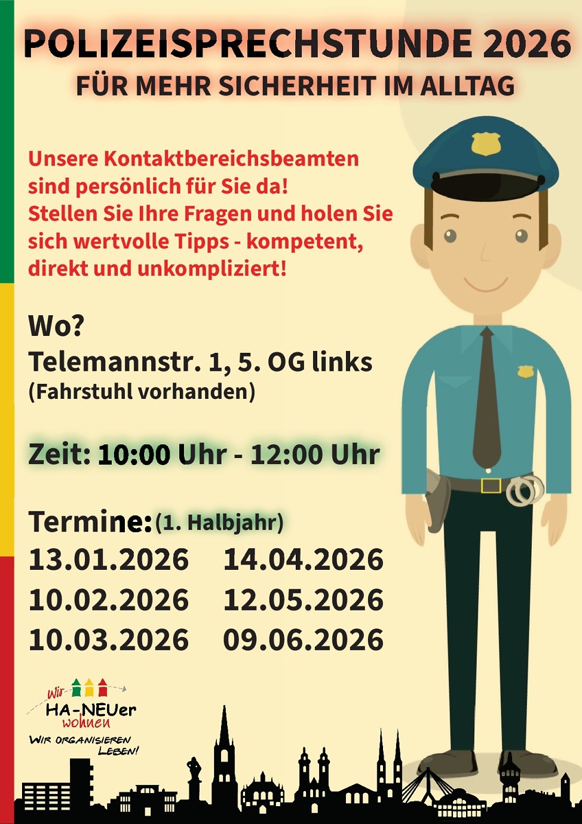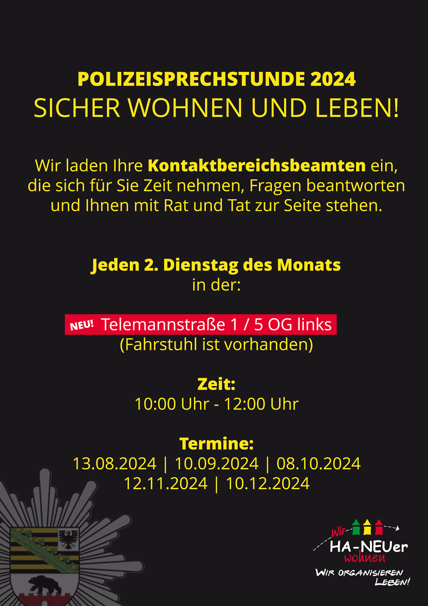 Die Polizeisprechstunde wird 2026 fortgesetzt. Jeden zweiten Dienstag im Monat von 10.00-12.00 Uhr in der Telemannstraße 1, 06124 Halle.