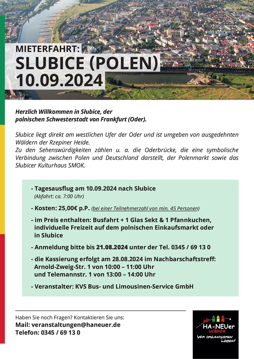 Zusammen mit Ihnen freuen wir uns auf unsere zweite Mieterfahrt in diesem Jahr ins beschauliche Örtchen Slubice in Polen.