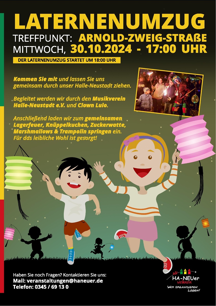 Gemeinsam mit Groß und Klein ziehen wir am 30.10.2024 mit unseren Laternen durch Halle-Neustadt. Für das leibliche Wohl ist gesorgt, Spiel und Spaß für unsere kleinen Gäste ist garantiert.