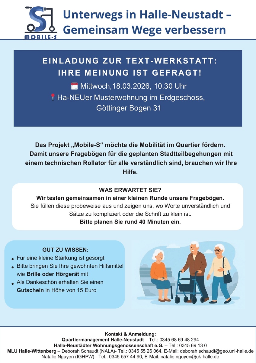Wir laden herzlich zur Text-Werkstatt ein. Gemeinsam testen wir Fragebögen für geplante Rollator-Rundgänge und schauen, ob alles gut verständlich ist.