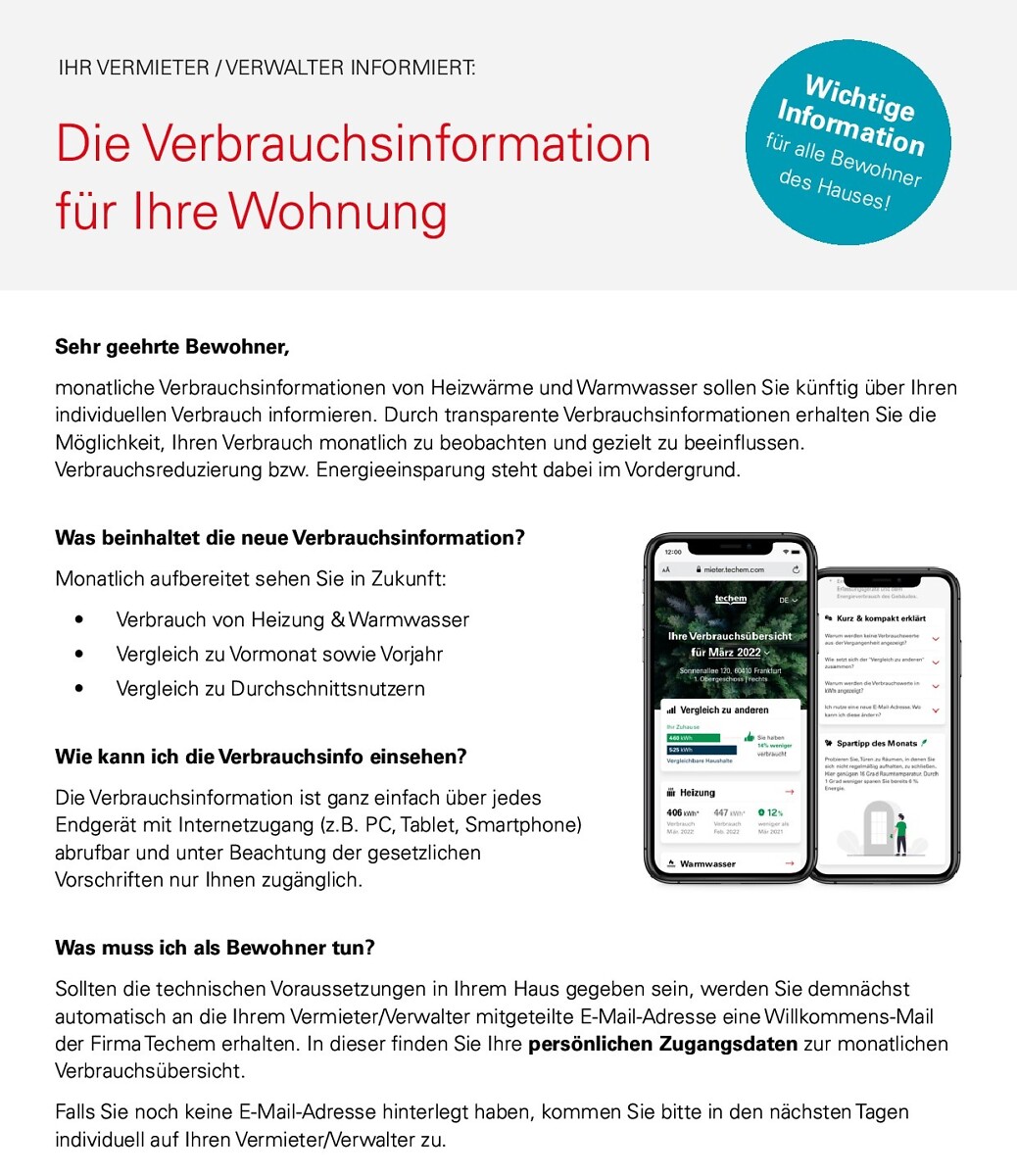 Seit dem 01.01.2022 müssen Vermieter allen Mietern und Mieterinnen über den monatlichen Verbrauch informieren. Dies erfolgt in der Regel postalisch (mit zusätzlichen Kosten verbunden), über ein Serviceportal oder per E-mail. Letzteres wird bevorzugt, da die Bearbeitung schnell und kostenfrei stattfinden kann.